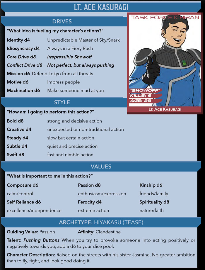 Mecha Vs Kaiju is powered by The 5th Engine, a narrative hybrid of modern storytelling games and 5th Edition. Create characters using Anime Archetypes with narrative traits. Here is a sample character, our iconic hot shot pilot, Ace Kasuragi.